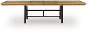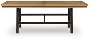 Features modern silhouette and reach in storage, covered in neutral fabric Urban Contemporary design with a rustic vibe. Made with hardwood solids, and thick rustic oak veneer. Natural wood may display natural weathering, unique cracks, splits, knots, saw marks or other organic features unique to each piece. Eclectic natural Oak and black finish scheme for a mix and match design style. Sturdy chunky legs support a thick table top with a rustic Oak finish. D841-01 spindle dining chair features a broad curved back rest with a modern take, finished in an aged black with rubbed-through edges. The cushioned seat is covered in textural woven polyester fabric. D841-02A arm chair features an inset synthetic cane back rest with a cushioned seat covered in a textural woven polyester fabric. Sideboard is finished in aged black with rubbed-through effects. Includes a reversible wine rack shelf, one adjustable shelf behind each cabinet door, synthetic cane door accents. The center drawer has fully finished drawer interior, with ball-bearing side guides and black felt bottom. D841-55 rectangular extension table features classic trestle table design in a two-tone finish. Aged black base with natural Oak top two 18” removable center leaves, can seat up to 10. D841-00 storage dining bench._x000D_